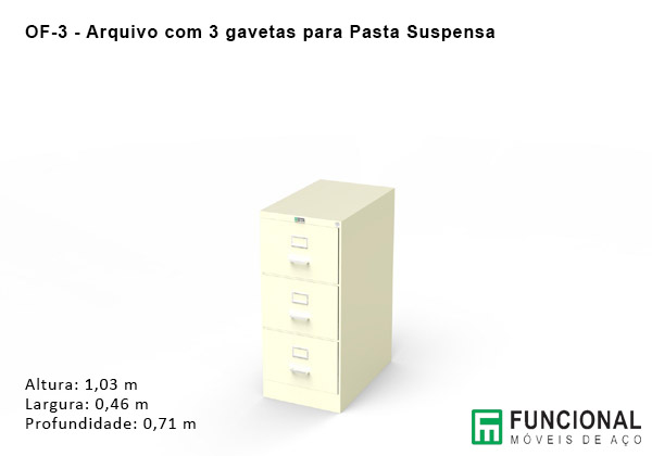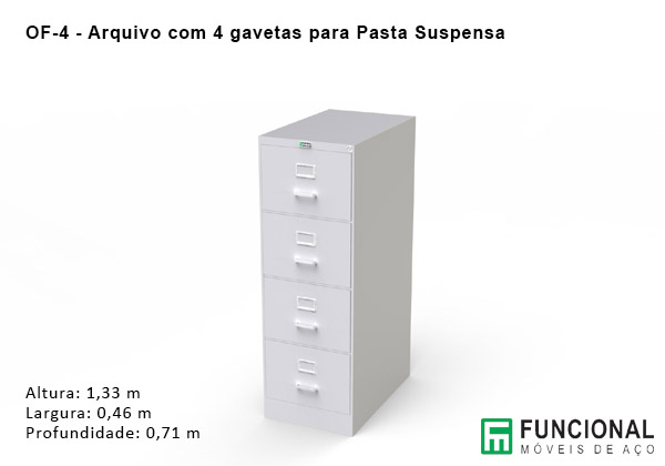 Arquivo de aço, reforçado, com gavetas correndo sobre carrinho telescópico, com 8 rolamentos esféricos de aço, puxadores e portas-etiqueta cromados, fechadura tipo “Yale”. Corpo confeccionado em chapa “22” (0,75 mm), estrutura interna em chapa “16” (1,50 mm) (calhas, carrinhos e cantoneiras das gavetas).