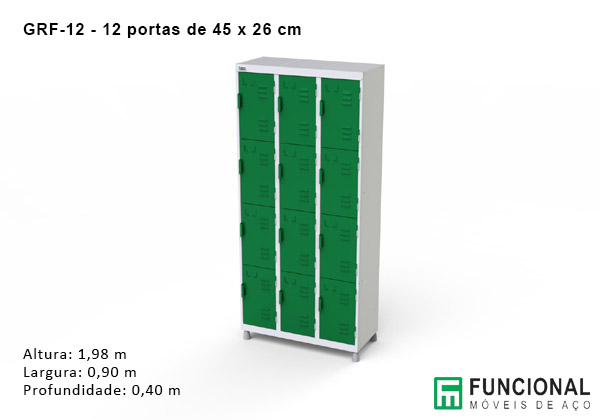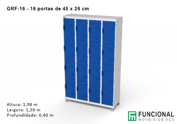 Guarda volumes de aço, reforçado, tipo escaninho para academias, vestiários e empresas. Portas pequenas com venezianas para arejamento, pé plástico de alta resistência, com regulagem para pequenos desníveis do piso, corpo e porta confeccionados em chapa “22” (0,75 mm) e moldura frontal em chapa “18” (1,20 mm).